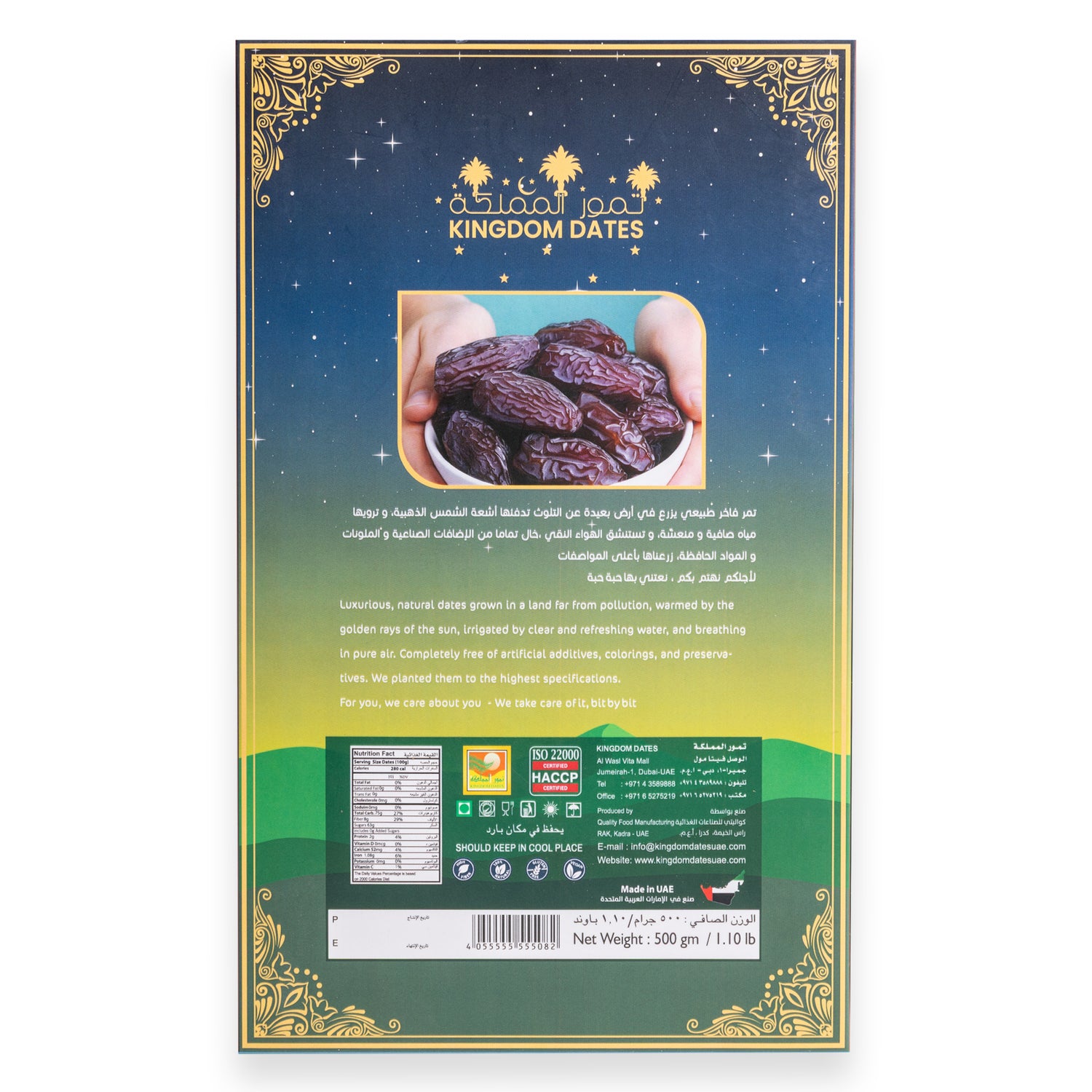 - صُنعت هذه التمور العربية الفريدة بفخر هنا في الإمارات العربية المتحدة، وهي مثالية لأخذها إلى المنزل كتذكارٍ لمغامراتك الشرق أوسطية المميزة. شارك ذكرياتك واستمتع بها مع كل قضمة طرية ولذيذة ومقرمشة.