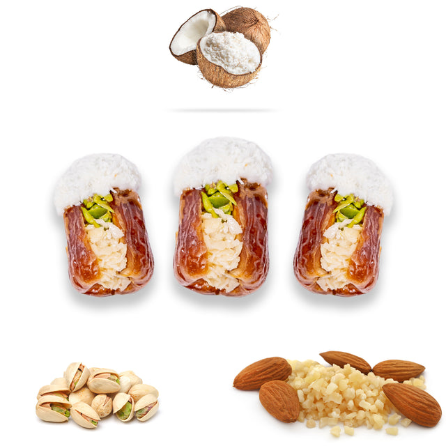تمر ساجي فاخر محشو بالمكسرات ومغطى جزئيًا بشوكولاتة جوز الهند