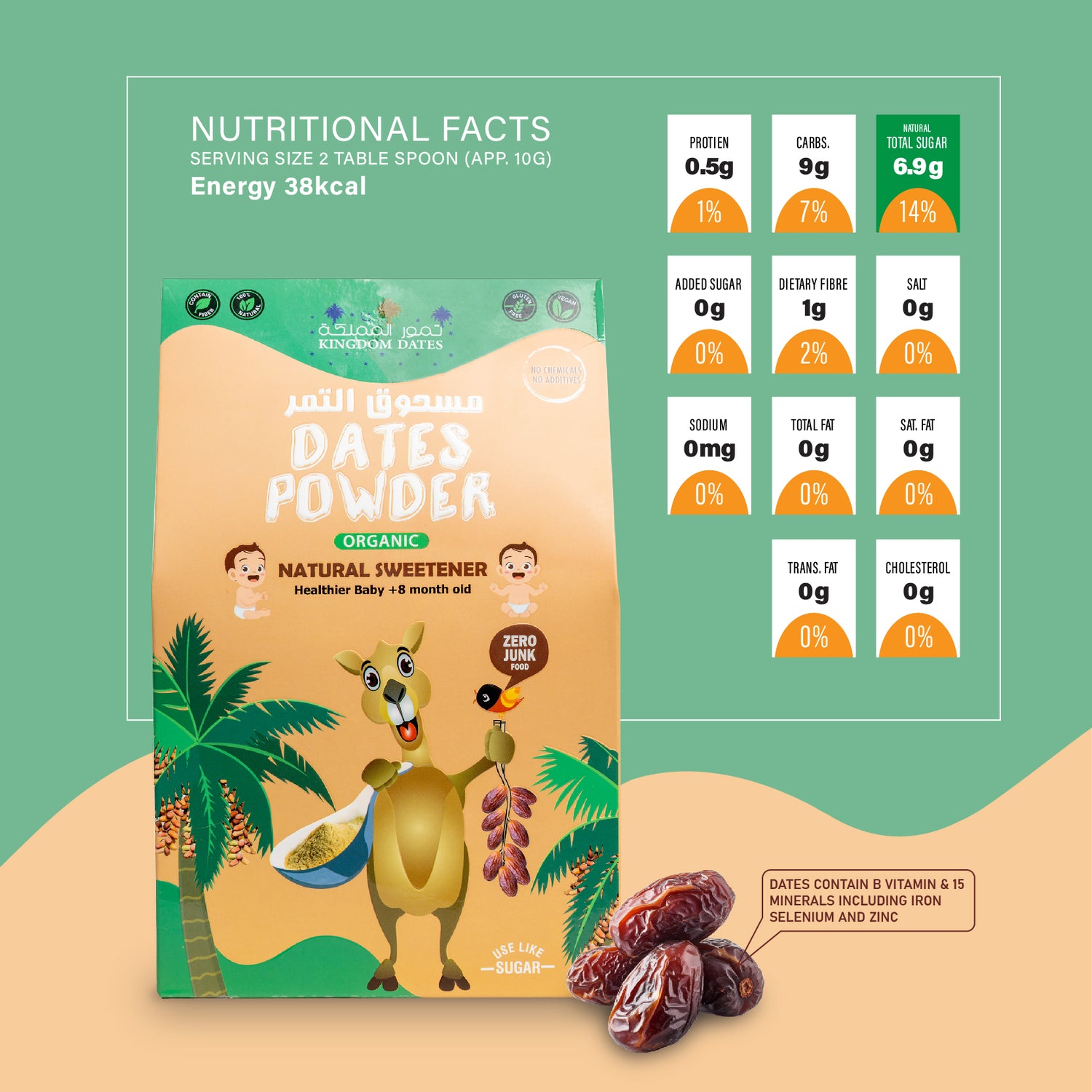 Discover the natural sweetness of Kingdom Dates Organic Dates Powder – a healthy sugar substitute for kids (8+ months) and the whole family. Made from 100% premium organic dates, carefully sourced and finely ground, our dates powder is the perfect way to sweeten meals without refined sugar.
