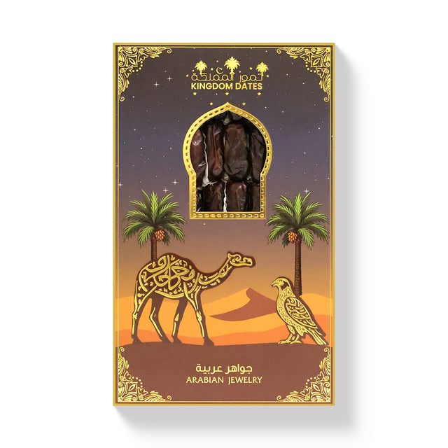 Indulge in the royal taste of Arabia with this elegant Royal Arabian Jewelry Box from Kingdom Dates. Each piece is filled with handpicked, premium dates that capture the true essence of Middle Eastern luxury.