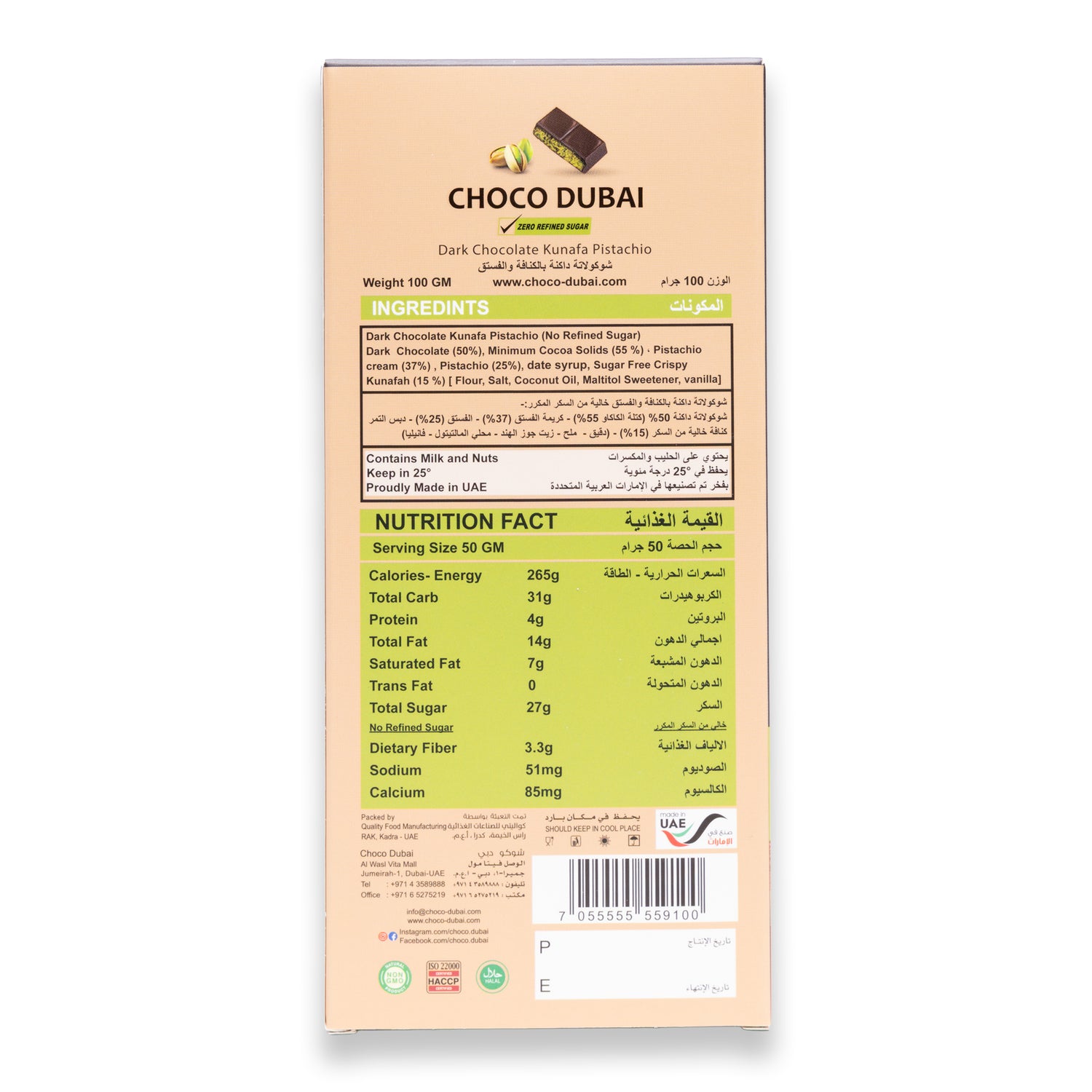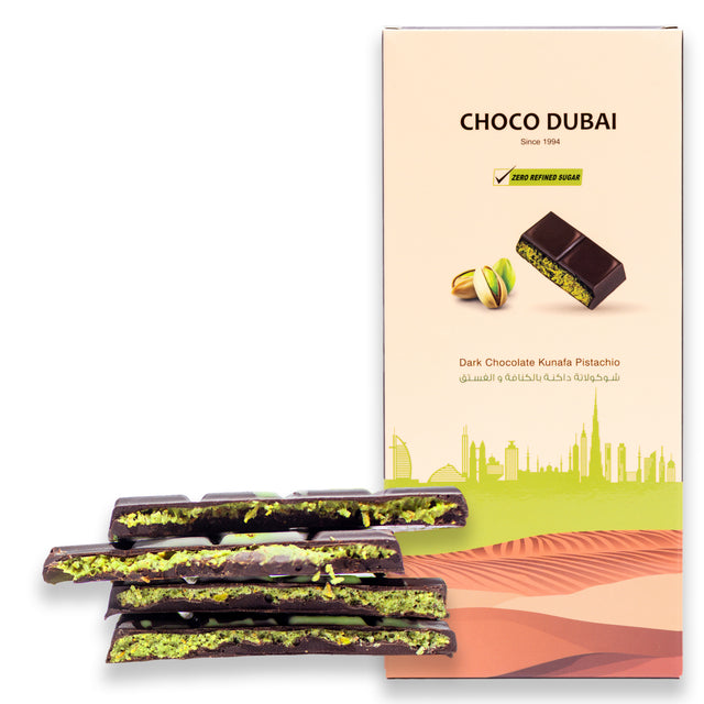 Indulge in the luxurious fusion of tradition and wellness with Choco Dubai's Dark Chocolate Kunafa Pistachio – Zero Refined Sugar.