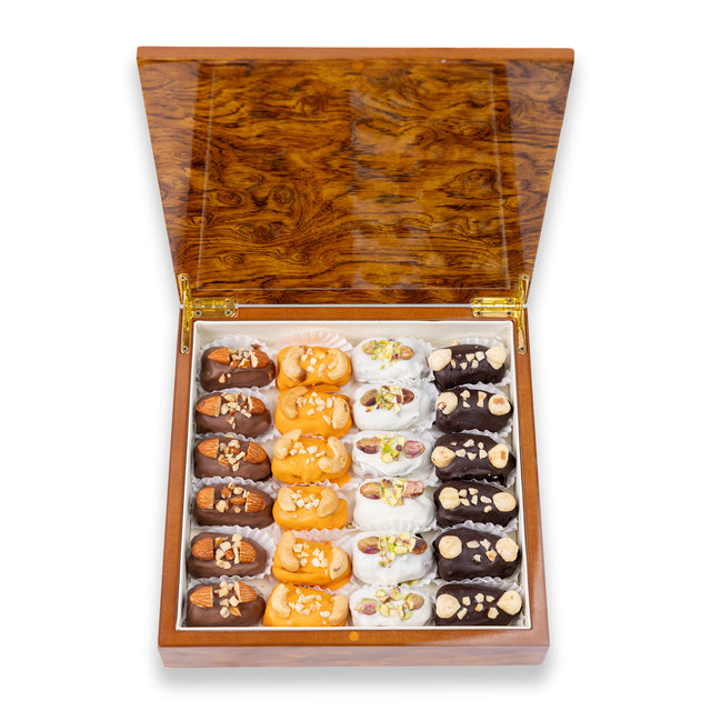 Experience the luxury of premium stuffed dates, filled with crunchy gourmet nuts and coated in smooth, assorted chocolate. Elegantly garnished for a refined finish, this 500g selection comes in a carbon fiber box — perfect for gifting, sharing, or treating yourself.