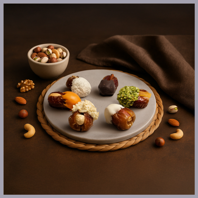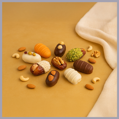 Luxury Khedri Dates Stuffed with Nuts & Half-Dipped in Almond Chocolate