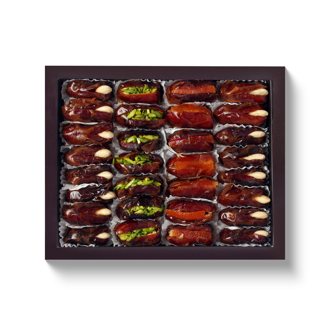 Elevate your snacking experience with Kingdom Dates, where natural sweetness meets gourmet elegance. Our handpicked, soft dates are filled with a delightful medley of crunchy almonds, zesty orange peel or walnut, and rich pistachios, creating a perfect harmony of flavors in every bite.