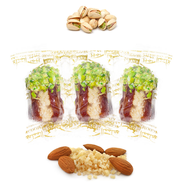Роскошные финики сорта «Кхедри», фаршированные орехами и наполовину обваленные в фисташковом шоколаде